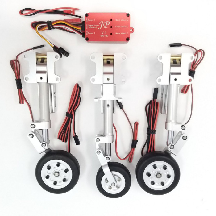 CNC Machined aluminum articulated and mecanical suspended « scale » electric landing complete gear set including 1x45mm front wheel and 2x55mm wheels with brakes system and 3 retracts with a JP Hobby V1 version All integrated controller retract box which includes an electrical magnetic brake controller. Main gear and single nose gear. For planes up to 8kg.