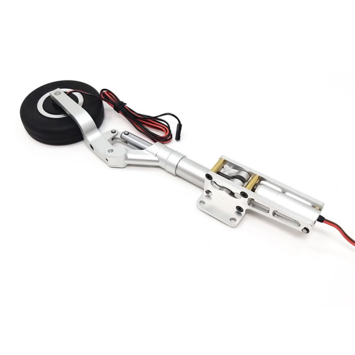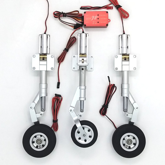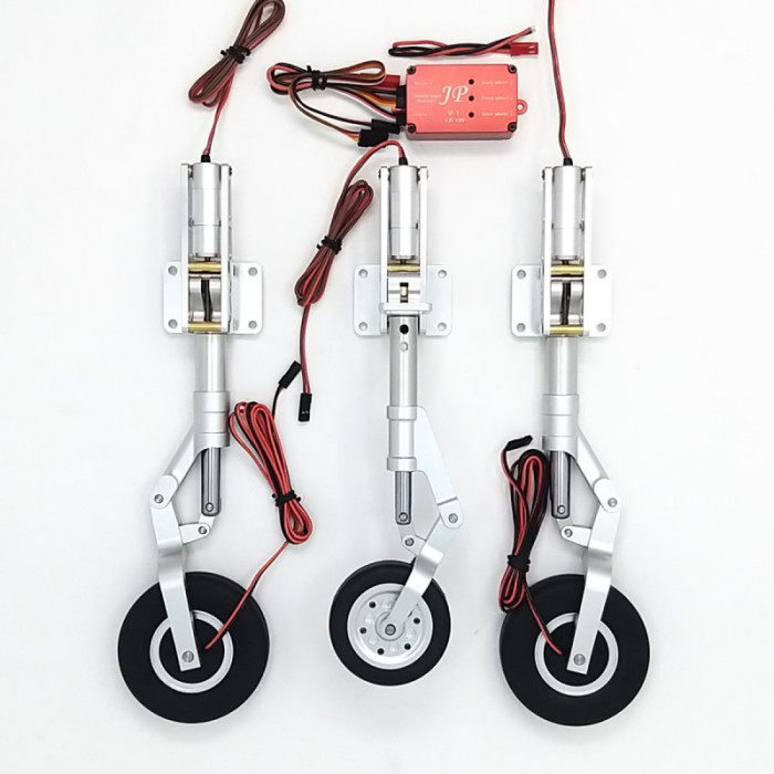 CNC Machined aluminium articulated and mechanical suspended « scale » electric landing complete gear set including 50 and 60mm wheels with brakes system and 3 retracts with a JP Hobby V1 version controller retract box which includes an electrical magnetic brake controller. Main gear and single nose gear. For planes up to 12kg.