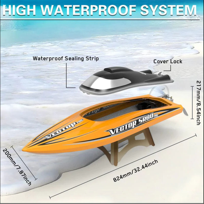The Remote Control Boat Vector SR80 PRO has a big size with excellent performance. Due to the auto roll back functionracesprevent theelectric partsbest performancewhich can, , transmitter and, and well designed structure with water fins and trim tabs keep the boat can stably running with high speed and shuttles flexibly around obstacles on lakes or even rivers.
